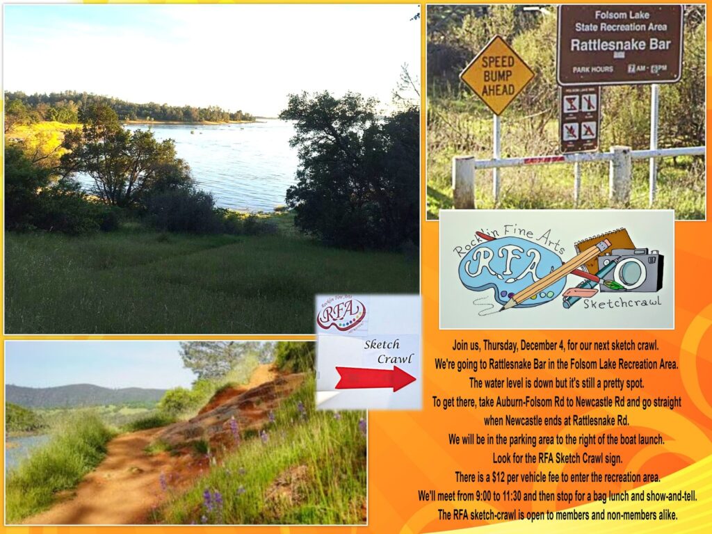 SketchCrawls are held the 1st Thursday of each month. an informal meet-up of artists in an interesting local place. Participants bring something to draw with and something to draw on, or a camera. Sketchcrawls typically start in the morning, last about two hours and are followed by a show-and-tell lunch. locations are normally announced only a few weeks in advance, so for information, please visit our Facebook page, or add your name to our mailing list. rocklinfineart@gmail.com