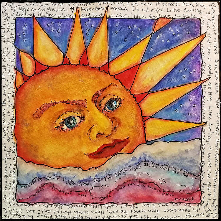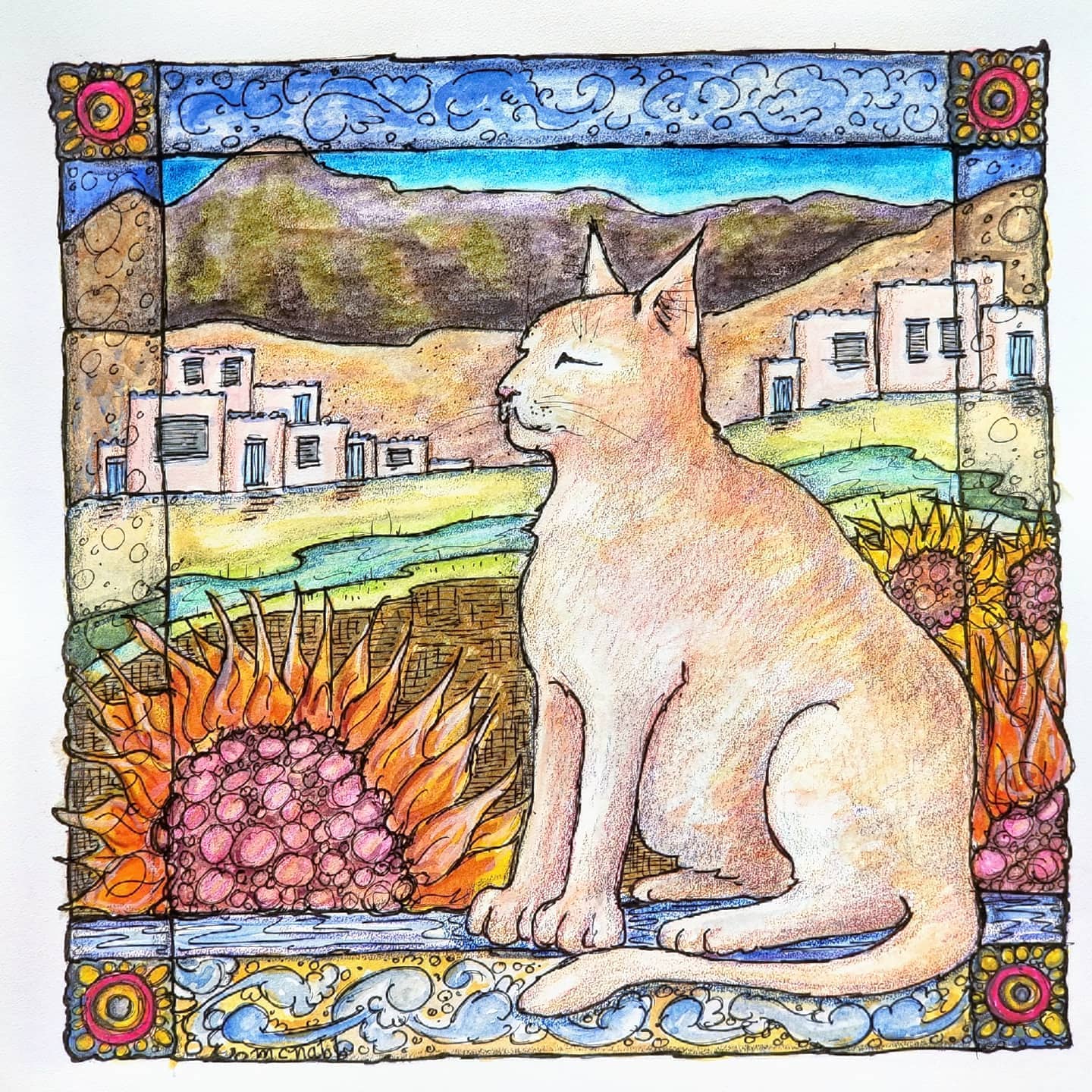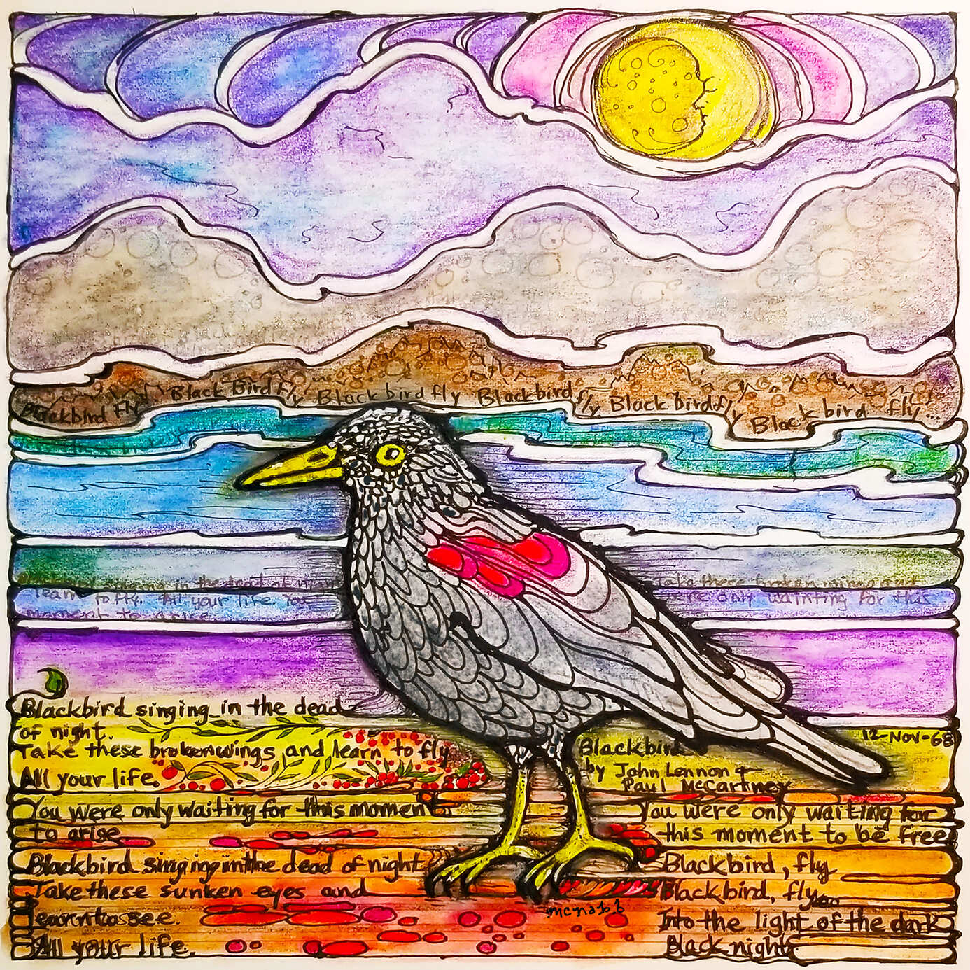 I like to add borders around the main image that tell their own story and experiment with drop shadows and different weights of black outline to create a stained glass look to the drawing.