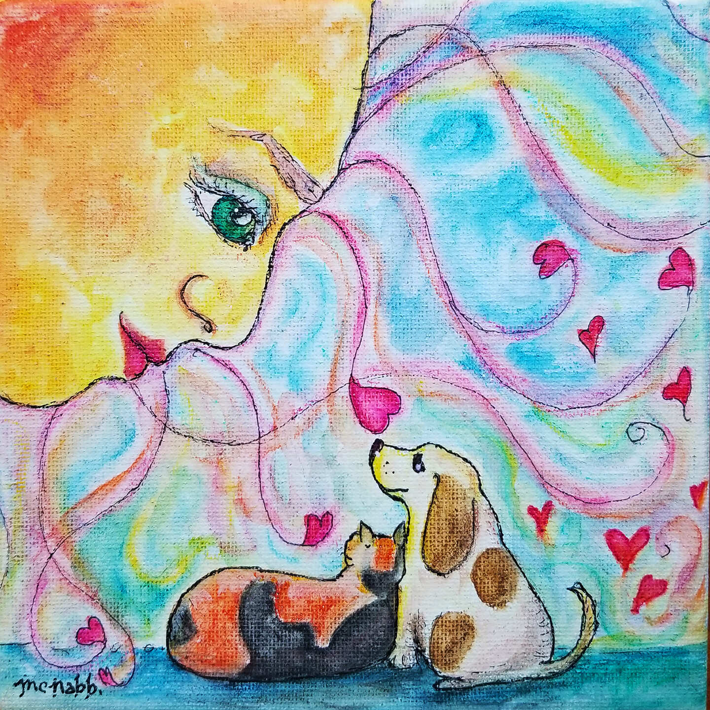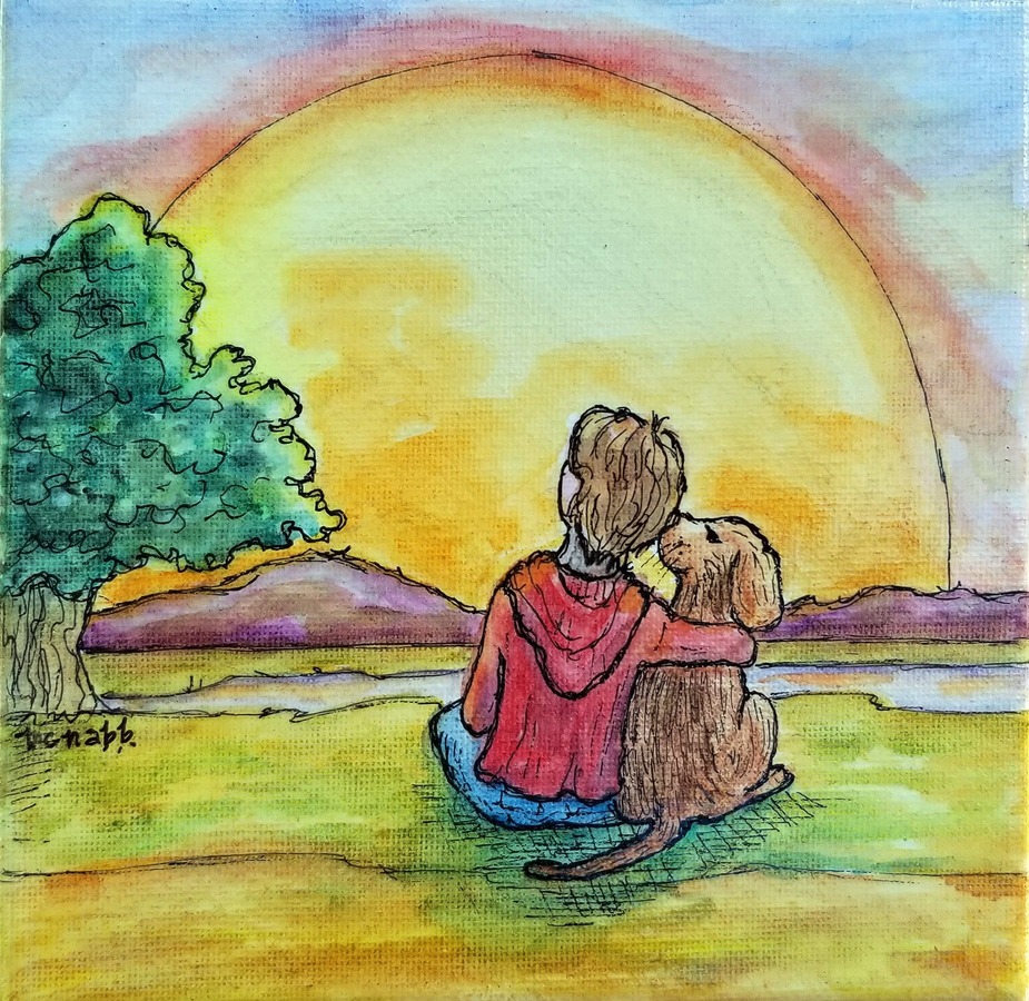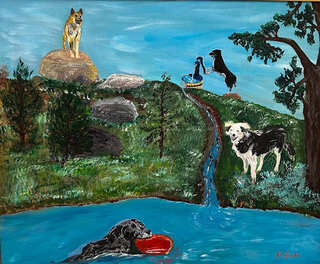 The acrylic painting titled Other Side of the Rainbow Bridge depicted our family's four dogs frolicking as a pack amid their divine forever home.